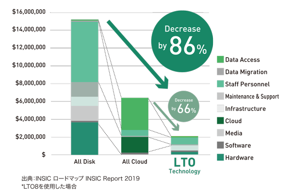ディスク/クラウドに比べ、テープストレージはコスト優位性があり、特に大容量データ保存でコストメリットが高くなります。